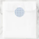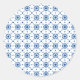 A circular sticker features a repeating blue floral pattern on a white background, set above a sheet displaying multiple stickers with the same design. The tone is elegant and classic.