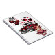 A cute teddy bear holds a heart-shaped sign in front of a vintage car adorned with plaid patterns. Floating hearts add to the whimsical charm.