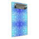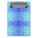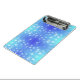 A clipboard featuring a blue and teal bokeh pattern, with round white dots giving it a soft, calming effect. The metallic clip is shiny and reflective.