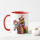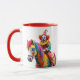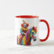 A clown rides a rainbow horse. mug