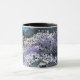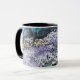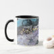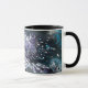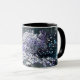 A coffee mug with purple and blue artwork
