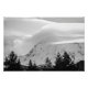 A black and white photograph of Mount Rainier. There are trees in the foreground. There are lenticular clouds forming and filling the surrounding sky at the top of the sleeping volcano. Image Copyright ©2023 Kimberly J Tilley. zazzle.com/store/developingnature
