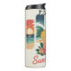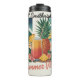 This collage features a refreshing summer theme, centred around a tropical drink with pineapple slices. The background is divided into four panels depicting classic beach scenes: a golden sunset, a crashing wave, a pier, and a beach with palm trees and a sunhat. The art has a vibrant, vintage look with a distressed border and the words "Summer Vibes" at the bottom.