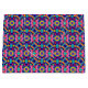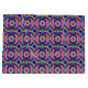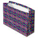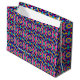 A colorful gift bag with a vibrant geometric pattern in blue, pink, and yellow. The bag features white handles, creating a lively and festive feel.