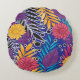 a colourful flower and leaves pattern on a blue ba round cushion