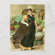 Vintage illustration showing a cook at the market wearing a headdress and traditional costume of Central Europe. Such a vibrant scene with lots of colourful fruits and vegetables in baskets along the cobblestone street. There are carrots, cabbages, cauliflower, broccoli, peas and beans.