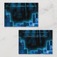 A cool dj businesscard template with a stunning design of a big pile blue flurocent glowing speakers and blue laser lights in the night sky combined with black backlight music notes on a dark background.