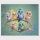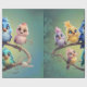 A cute cartoon bird parade in vibrant colours. The birds are designed in bright, colourful tones, including blue, yellow, pink, and blue-green. Their large, expressive eyes radiate joy and curiosity, giving the entire scene a carefree and cute atmosphere. The background is a soft green and features a gentle gradient that draws the focus to the birds.
