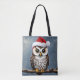 Totally cute little owl with big eyes, wearing a Santa hat. He's perched on a tree branch as snow falls around him. Absolutely darling holiday tote bag!
