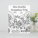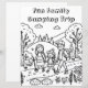 Cute colouring page with a with a camping theme. A family walking through the hiking trails through trees and mountains on their camping trip. Cute colouring page for kids or adults.