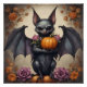 A Cute Halloween Bat with expressive eyes is portrayed against a soft, blurred background with a pumpkin and flowers. The natural colours enhance the bat appearance.