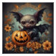 A Cute Halloween Bat with expressive eyes is portrayed against a soft, blurred background with a pumpkin and flowers. The natural colours enhance the bat appearance.