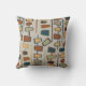 A cute mid century inspired throw pillow, with geometric pattern in warm retro colours of brown, orange, blue and green.
