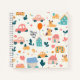 Cute children's notebook with pastel colours and a pattern of small cartoon houses, cars, and animals on bright background, spiral binding.