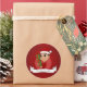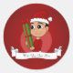 Round sticker with an illustration of a cute smiling happy Hispanic/Latino or Asian toddler boy, he is wearing a red and white Santa Claus hat and holding a Christmas present; with an editable text template for your name or message, a Christmas holidays design with a red background