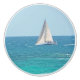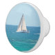 THIS CUSTOM CERAMIC KNOB FEATURES A SAILBOAT OUT ON THE BLUE-GREEN OCEAN. SEVERAL PEOPLE CAN BE SEEN SITTING ALONG THE SIDE WITH THEIR FEET DANGLING OVER THE EDGE OF THE BOAT. A THOROUGHLY RELAXING SCENE. GREAT HOME DECOR ACCENT FOR A BEACH/LAKE HOUSE!