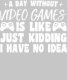 Funny quote for gaming lovers "A DAY WITHOUT VIDEO GAMES IS LIKE JUST KIDDING I HAVE NO IDEA". Take your gift for you or for the person who do you love mum, dad, brother, sister, friend. Funny gifts ideas for gaming lovers.