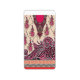 A decorative paisley design with vivid red and pin label
