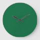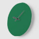 A deep green background contrasted by a crisp whit large clock