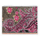 • Central Design: The main part of the fabric showcases large, stylised flowers and paisley shapes in shades of pink, white, and black. These motifs are set against a brown background that has a textured, crackled leather appearance.