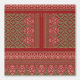 The design appears to be a traditional textile design. It features a symmetrical pattern with a central column and intricate borders on each side. The colour palette includes earthy tones like shades of red and brown, with detailed motifs in white and beige. The patterns consist of geometric shapes, diamond-like figures, and decorative elements that resemble floral designs.