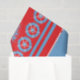 The design features a beautiful, symmetrical fractal-like design. It has intricate, lace-like patterns with a colour scheme of red, blue, and white. The symmetry and complexity of the design make it visually striking and interesting, often associated with mathematical beauty and artistic expression.
