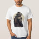 An illustration of a samurai in front of ta circular background, in the style of moody dark grey and light bronze colour schemes, highly detailed brushwork