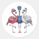 A featuring three unique flamingos that are quite classic round sticker