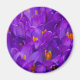 A lovely nature photograph of a field of bright blooming crocuses, vibrant purple petals with bright yellow orange centres.