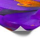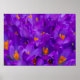 A lovely nature photograph of a field of bright blooming crocuses, vibrant purple petals with bright orange centers.