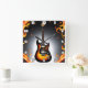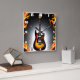 A stunning guitar stands boldly with flames dancing around it, showcasing its unique design and vibrant colours in a dramatic atmosphere.