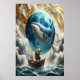 A surreal painting depicting a fisherman in a small boat, reeling in a giant blue whale that is connected to a swirling blue orb, all against a backdrop of golden clouds and dramatic waves.