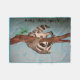 A throw with the image of a racoon hanging from a branch, and the print. "A little help, here"