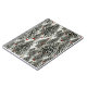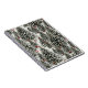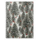 Notebook in a forest of snow covered Christmas trees, in black, white and grey, with a scattering of little red packages