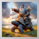 This captivating fantasy artwork features a robust dwarf warrior, wearing battle gear, resting beside his fierce companion. Set against a breathtaking landscape of serene rivers and dramatic skies, this duo embodies both strength and camaraderie. Perfect for lovers of fantasy, mythology, or anyone seeking a whimsical yet epic piece for their space.