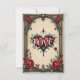 A gothic romance. An ornate, gothic-style frame surrounding a beige background. Red roses with dark green leaves are arranged around the frame, particularly in the corners. At the bottom centre, there is a decorative heart-shaped emblem with the word "LOVE" inscribed in a stylised font.