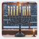 Happy Hanukkah! A pretty illustration of a menorah on a window sill on a snowy winter day.