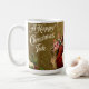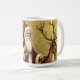 This vintage-style holiday mug features a classic illustration of Santa Claus dressed in a traditional long red robe with white fur trim, carrying a sack overflowing with dolls and toys over his shoulder. He stands alongside a large reindeer, holding its leather bridle against a textured, gold-colored background. The scene is framed along the bottom by festive boughs of holly with red berries and mistletoe with white berries,