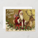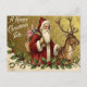 This design features a repeating Christmas pattern that looks like old-fashioned wrapping paper. It displays classic pictures of Santa Claus in his red suit standing next to a reindeer, along with large green holly wreaths tied with red ribbons that circle a snowy winter scene. The design is filled with traditional holiday details like lit candles, scrolls with greetings like "A Happy Christmas Tide," and warm colors that create a cozy and festive feeling.
