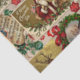 This design features a repeating Christmas pattern that looks like old-fashioned wrapping paper. It displays classic pictures of Santa Claus in his red suit standing next to a reindeer, along with large green holly wreaths tied with red ribbons that circle a snowy winter scene. The design is filled with traditional holiday details like lit candles, scrolls with greetings like "A Happy Christmas Tide," and warm colors that create a cozy and festive feeling.