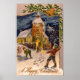Christmas postcard with two young boys engaged in snowball fight outside church as people enter, with partial border of evergreens and gold bell and "A Happy Christmas." Colour postcard, ca. 1911. Missouri History Museum Photographs and Prints Collections.