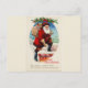 A colourful and cheerful Santa with a bag of toys stepping onto a brick chimney. Greeting: A Happy Christmas ~ Santa brings a pack of cheer ~ For Christmas and the coming year. Image of a Vintage Santa Christmas Postcard on a custom (light yellow) beige background.