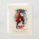 A colourful and cheerful Santa with a bag of toys stepping onto a brick chimney. Greeting: A Happy Christmas ~ Santa brings a pack of cheer ~ For Christmas and the coming year. Image of a Vintage Santa Christmas Postcard on a custom (light yellow) beige background.