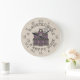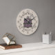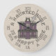 This clock expresses the spooky sentiment "a haunted home is a happy home" in a faux cross stitch pattern.