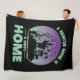 Introducing our spooky and stylish "A haunted house is a happy home" fleece blanket. The perfect addition to your Halloween decor, this blanket features a black background with the words "a haunted house is a happy home" in a creepy sea green font. The circular picture in the centre of the blanket showcases a purple background with a sinister-looking haunted house, barren trees and creepy birds and bats flying in the sky.
