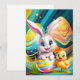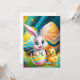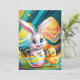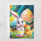 A cheerful bunny peeks out of a decorated egg, accompanied by an adorable chick, set against a vibrant, abstract background with colourful patterns. The scene exudes a playful and festive atmosphere, perfect for celebrating a springtime event. Digital Art