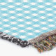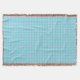 "A light blue and white checkered blanket with brown fringe. Shown in two orientations: horizontal and vertical, highlighting its texture and pattern."