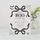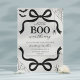 This design features Halloween baby shower theme "A Little Boo Is On The Way" with black bow and spooky spiders webs and spiders and flying bats to give it a cute but spooky Halloween vibe. Perfect for gender neutral baby shower in grey and black colours.