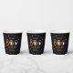 Cute Halloween-themed baby shower paper cups featuring the phrase "A little boo is almost due" in orange, yellow, and purple hand-lettering with white ghosts on a black background. Colourful stars and dots encircle the design. Personalise the Halloween baby shower paper cups with the mother-to-be's name.
