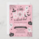 A little boo is almost due! Invite guests to your baby shower with this cute pink ghost and pumpkin Halloween baby shower invitation.